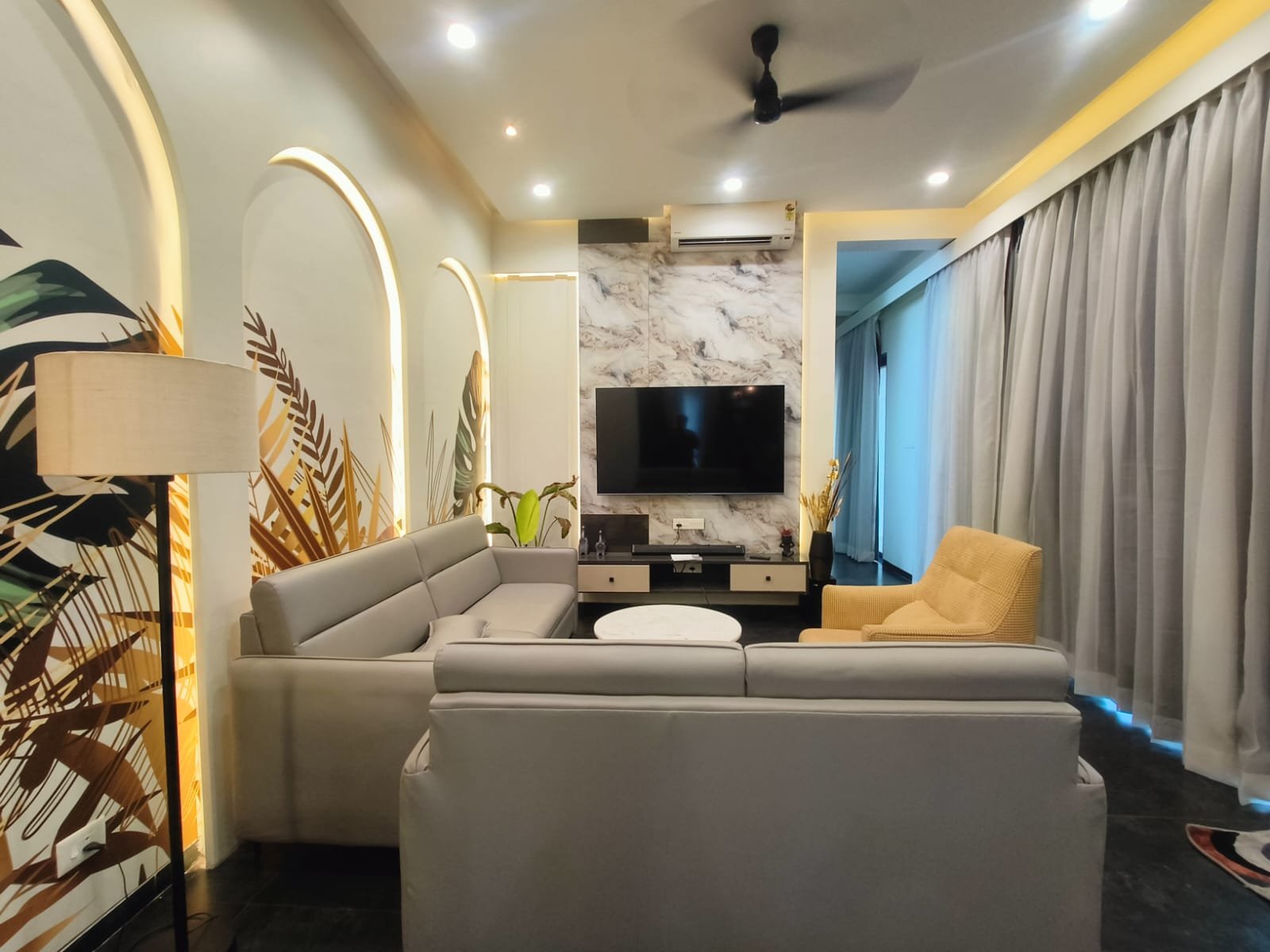 • Spacious living area with a flat-screen TV, cozy sofas, and ceiling fans for ultimate comfort